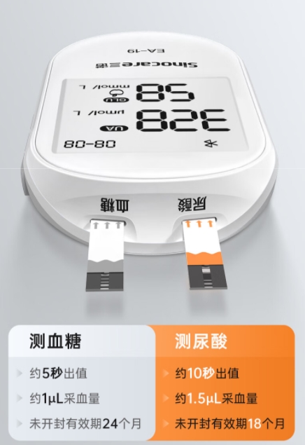 其实判断尿酸仪什么牌子的好用又准确,除了准度,品牌实力和使用体验也很关键。三诺是深耕家用检测领域20多年的老品牌了,市场口碑一直很稳,买他们东西心里先有了三分底。这款三诺尿酸仪EA-19还有免调码专利,试纸即插即测,不用像传统仪器那样反复手动调码,哪怕是老人也能轻松操作。对于需要同时关注血糖的人群,它的一机双测设计更是贴心,一次采血就能同时获取尿酸和血糖数据,5秒出血糖值、10秒出尿酸值,大大提升了检测效率。更方便的是手机互联功能,连接"三诺健康"小程序后,每次测量数据会自动上传,生成清晰的趋势曲线,复诊时直接展示给医生,比手写记录更直观准确。