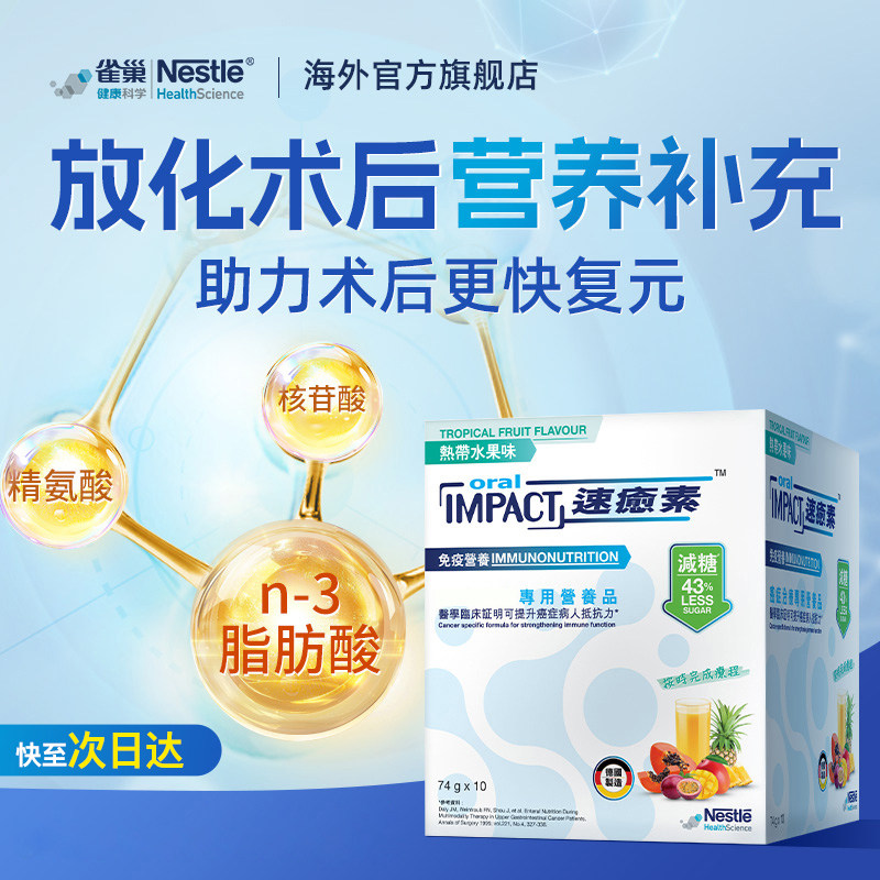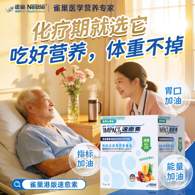 放化疗期间,患者常因严重的副作用导致进食困难,对高能量密度和抗炎营养有极高诉求。雀巢速愈素被誉为白细胞加油站,能有效助力指标提升。产品添加了奥米加3鱼油,不仅能抗炎,还能改善食欲,维持体重稳定。针对恶心呕吐导致胃口差的痛点,速愈素提供了橙子、香草、热带水果等多种口味选择,酸甜适口,能够有效激发味蕾,促进食欲。临床数据显示,服用速愈素能将严重口腔黏膜炎的发生率从一般饮食的45%降低至16%。
